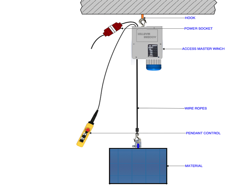 Comes with a pendant control, wire rope, lifting hooks and power socket
